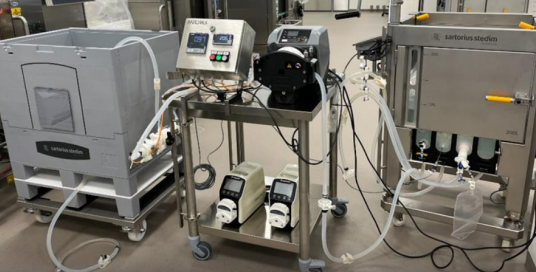 A filtration system equipped with a pump and disposable tubing is used to sterilize liquids during bioprocessing. The pump provides a controlled and steady flow, pushing the product through the filter while avoiding excessive pressure that could damage cells or sensitive molecules. The single-use tubing and filter capsules reduce contamination risk and eliminate cleaning steps, making the setup ideal for GMP operations.